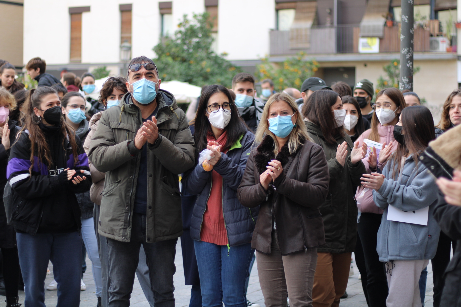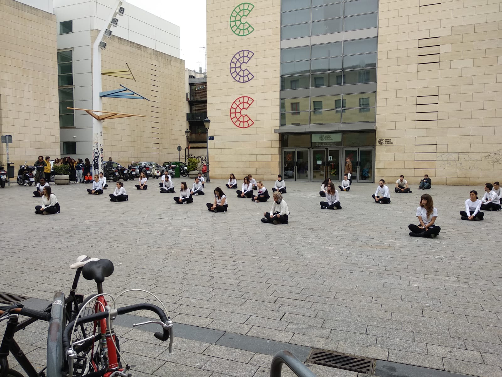 Mientras, dos estudiantes crean un grafitti sobre papel con el texto: 1.237 Trenquem el silenci. Las personas participantes levantan el grafitti al acabar la acción a modo de pancarta.