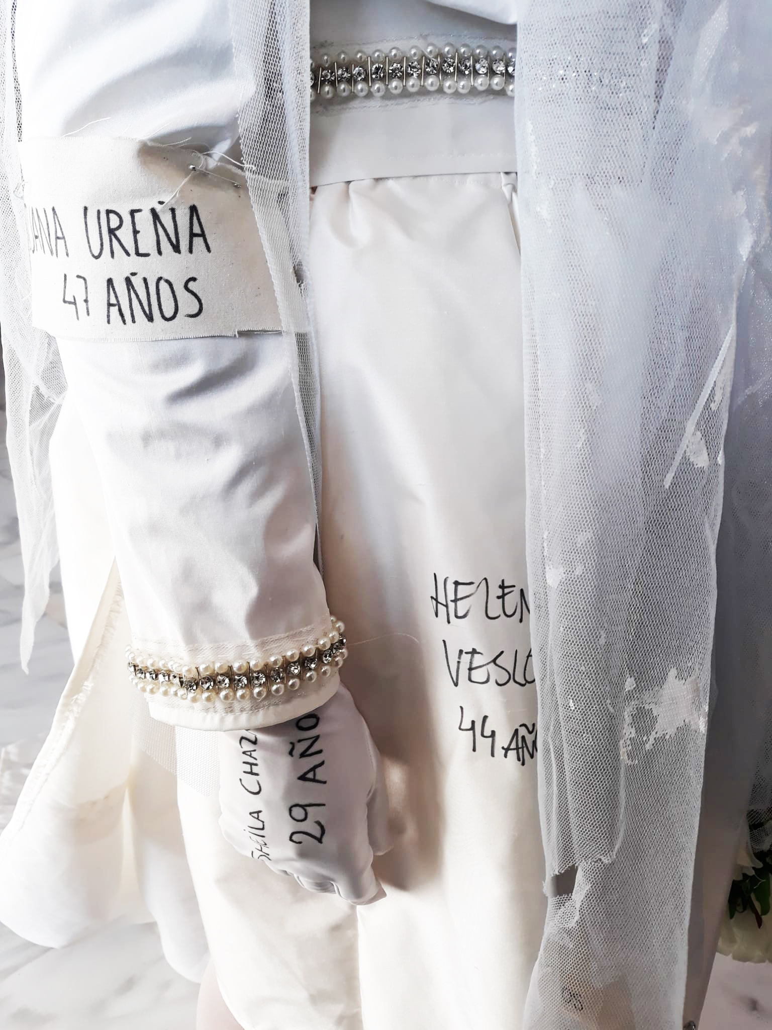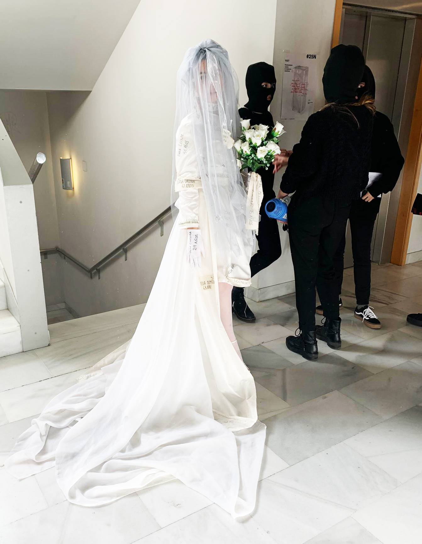 Una mujer vestida de novia y acompañada por un grupo de encapuchadas, que simbolizan el terrorismo machista, ponen de manifiesto que la violencia no es un problema de carácter privado, individual o de pareja ni es un problema de las mujeres, sino que es un problema público que afecta y compete a toda la sociedad, por eso, el traje que viste se llena con los nombres y apellidos de las 51 mujeres asesinadas en el 2019 y se pasea por la EASD València denunciado sus asesinatos y concienciando para que entre todas y todos unamos fuerzas para combatir la violencia de género. Con todos los nombres la novia sale a la calle donde será enterrada en una urna por el público y liberada con posterioridad mientras se citan frases machistas de grandes pensadores desde la Antigüedad a la actualidad.