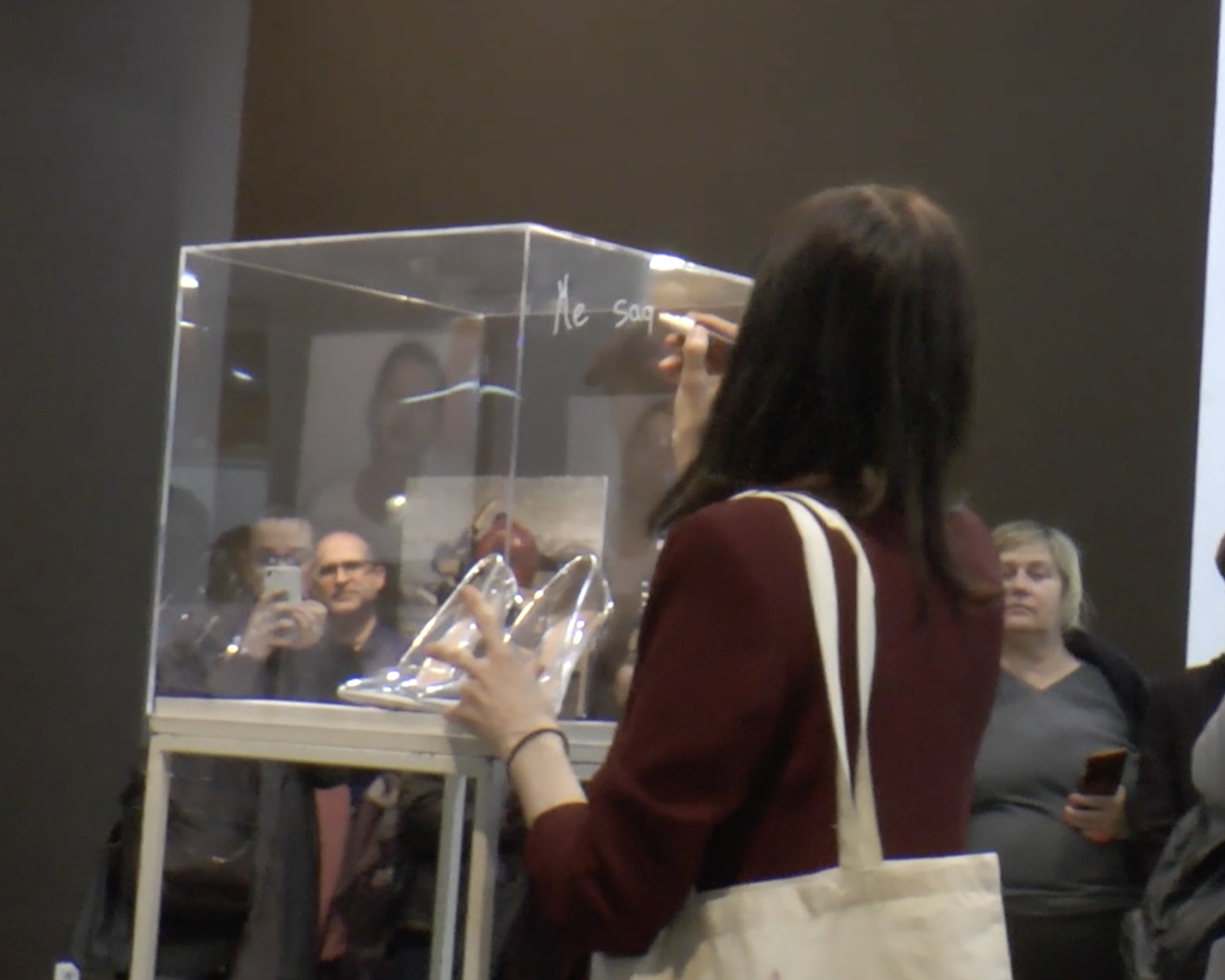 Al final de la performance, la artista se libera de los objetos, dejándolos caer al suelo con un impacto resonante que simboliza tanto la renuncia como la toma de conciencia sobre la desigual distribución de la carga mental.