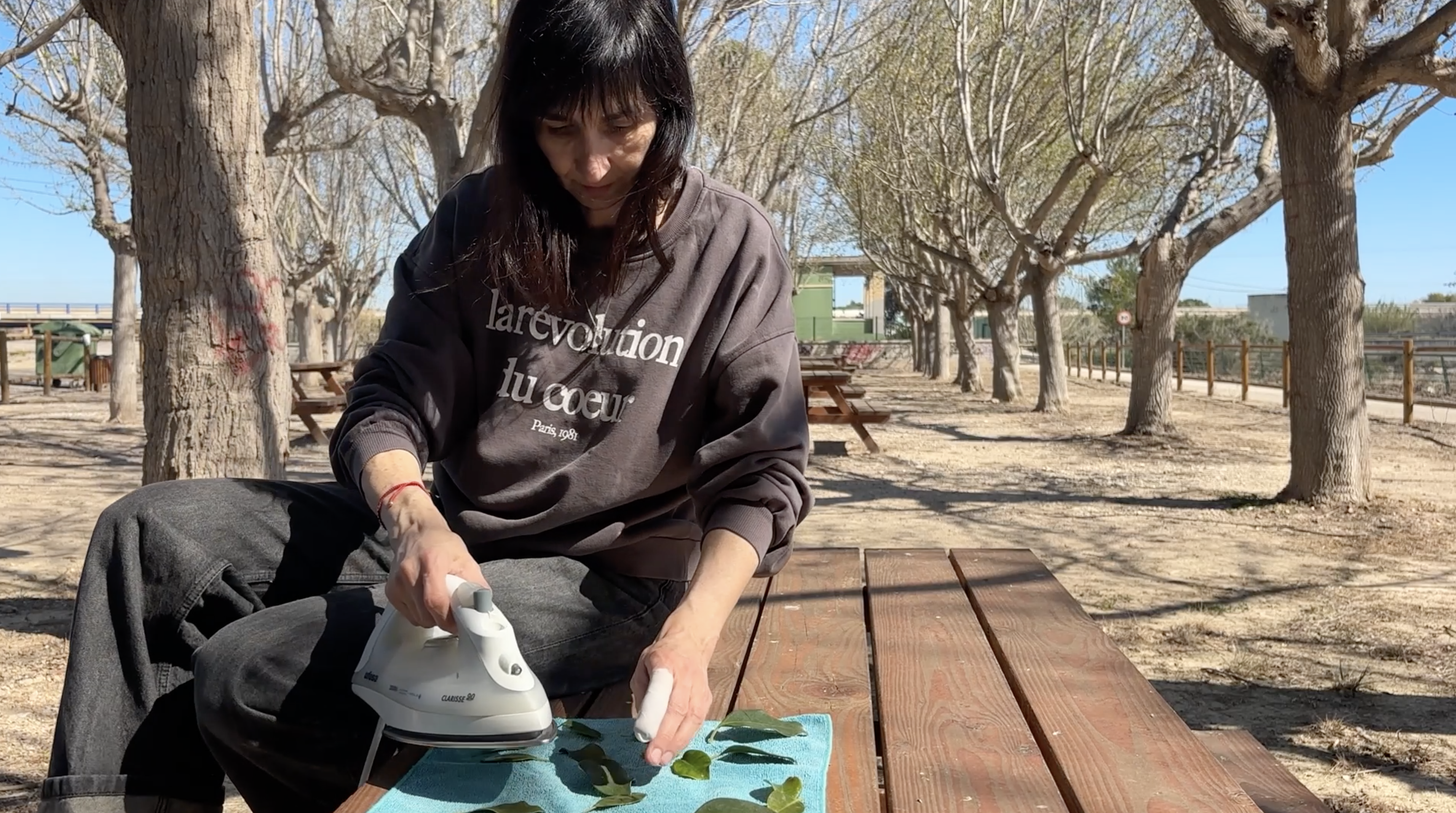 En esta acción, una mujer intenta planchar hojas sobre un paño en un espacio abierto. El gesto doméstico se repite con precisión, pero el aire lo desordena constantemente. Las hojas se desplazan, se separan, vuelan.